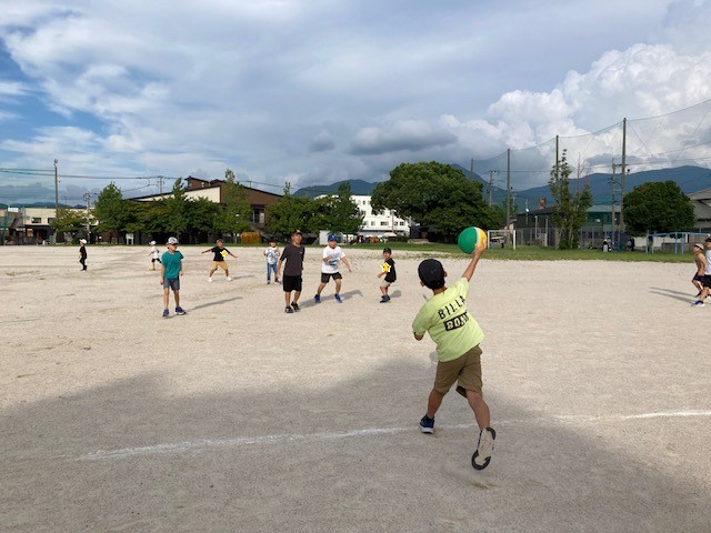 たくさんのこどもたちがドッジボールやブランコ、なわとび、鬼ごっこなどをして