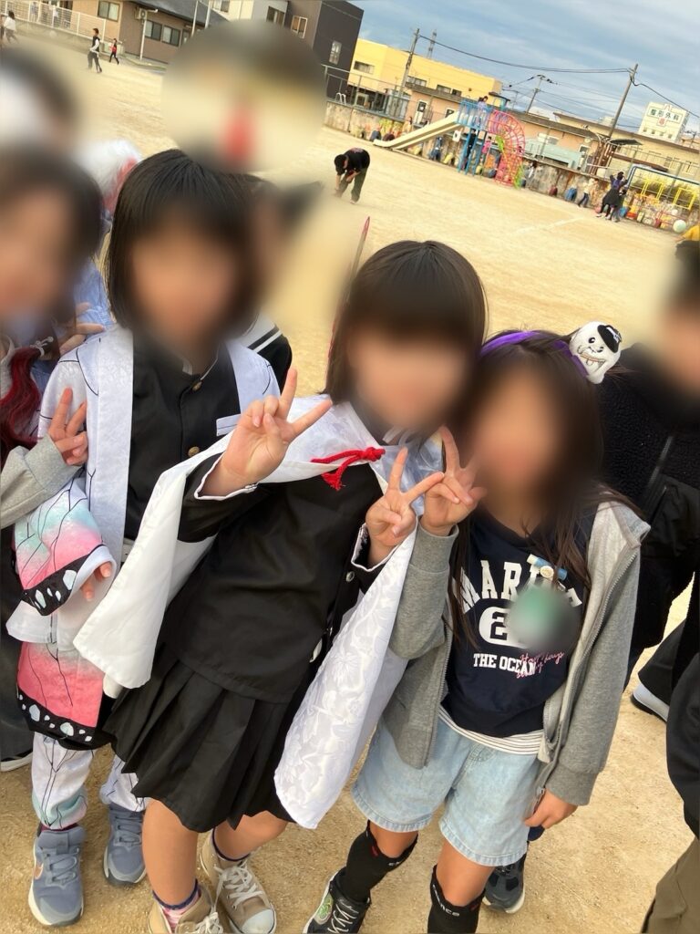 仮装したこどもたちが各クラスの先生のサインをもらうため、校庭を走り回っていました。