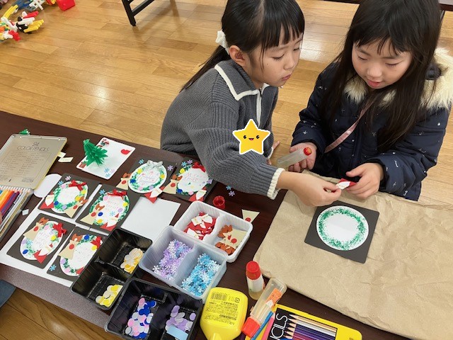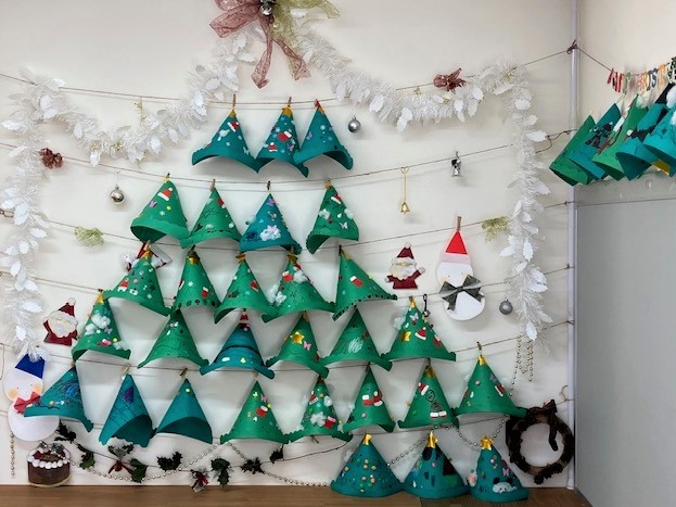 壁面にはこどもたちが飾りをつけた可愛いクリスマスツリーの帽子が並び、サンタさんへお願いを書いたクリスマスカードも出来ました。